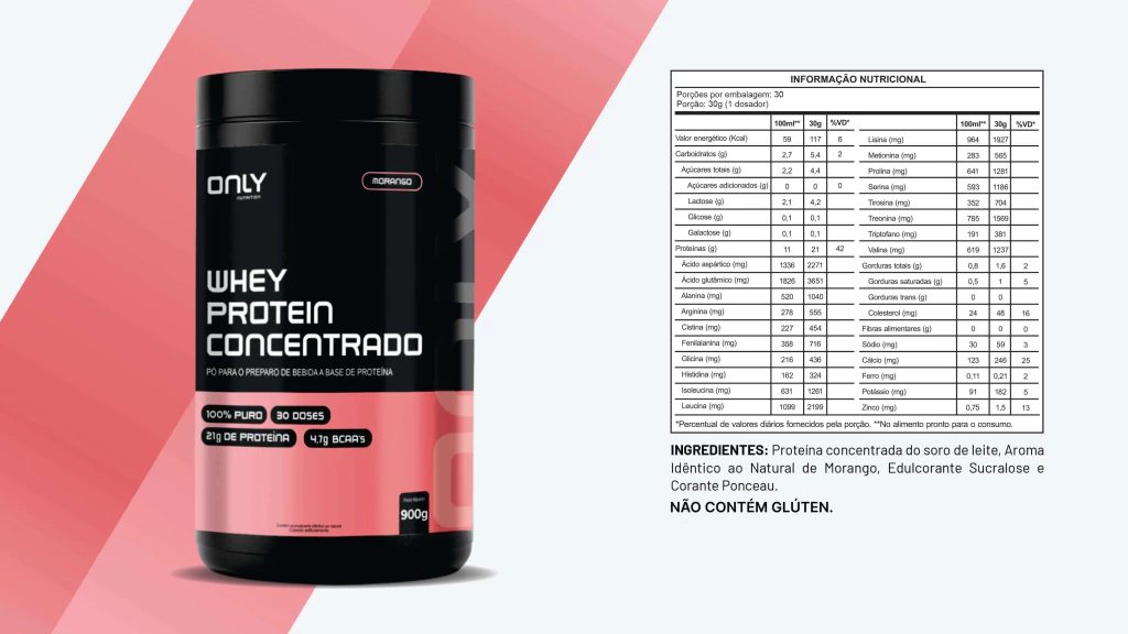 O Whey Protein Concentrado Only Nutrition é ideal para quem busca nutrição com máxima transparência e qualidade. Produzido exclusivamente a partir do soro do leite, entrega 70% de concentração proteica: em cada dose de 30g, são 21g de proteína pura, sem adição de colágeno, proteína de soja, milk protein (MPC).